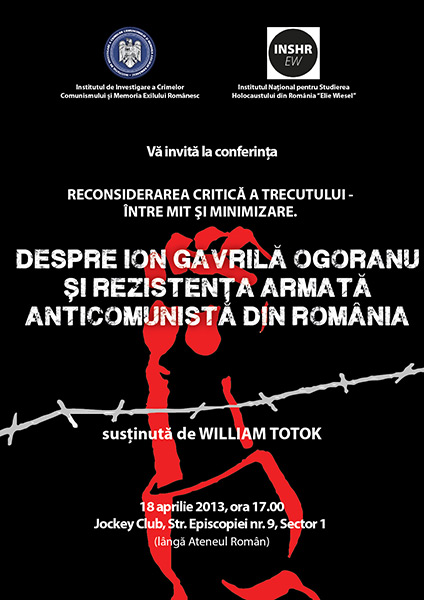 Institutul de Investigare a Crimelor Comunismului și Memoria Exilului Românesc, în parteneriat cu Institutul National pentru Studierea Holocaustului din Romania “Elie Wiesel”, a organizat joi, 18 aprilie 2013, ora 17.00, conferința Reconsiderarea critică a trecutului – între mit şi minimalizare. Despre Ion Gavrilă Ogoranu şi rezistenţa armată anticomunistă din România, susținută de cercetătorul german de origine română William Totok. Evenimentul a fost găzduit de Jockey Club, str. Episcopiei, nr. 9.