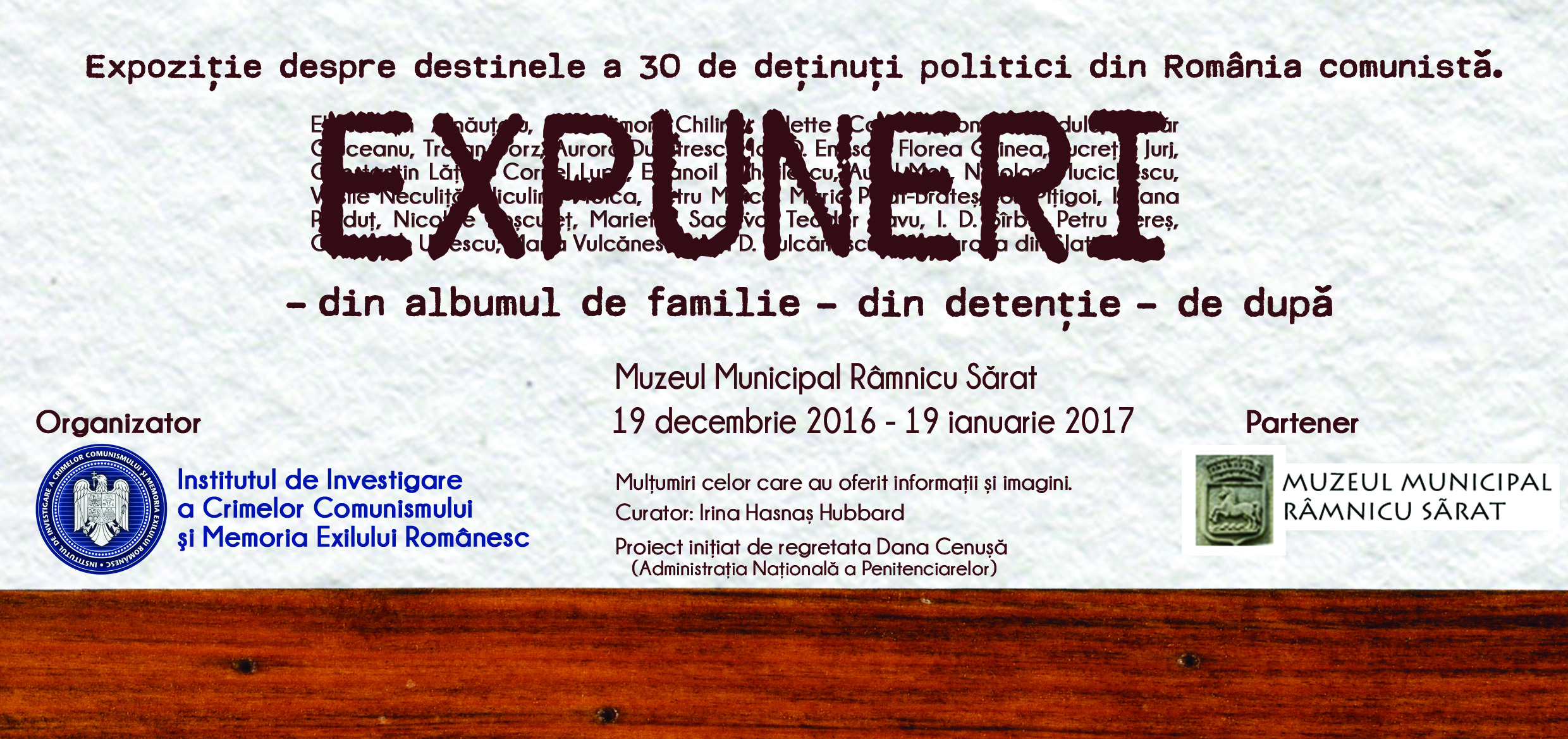 Institutul de Investigare a Crimelor Comunismului şi Memoria Exilului Românesc (IICCMER) a organizat luni, 19 decembrie 2016, la Muzeul Municipal Râmnicu Sărat, vernisajul expoziţiei EXPUNERI, care surprinde destinele unor foști deținuți politici din România comunistă în fotografii din albumul de familie, din detenție şi de după eliberare. Proiectul a fost iniţiat de regretata Dana Cenuşă (Administraţia Naţională a Penitenciarelor).